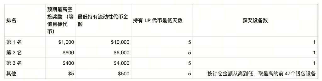 6. 在LP 代币持有阶梯挑战中,若所有参与者都未达到最低最低添加流动性金额和持有 LP 代币最低天数要求,则对应的空投奖励将不予发放。
