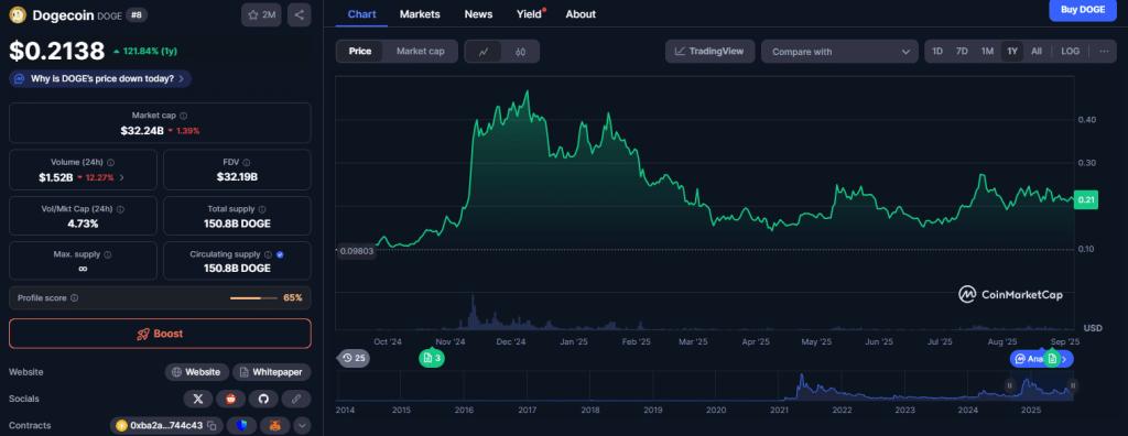 这一认可源于狗狗币 (DOGE) 的强劲上涨和大幅回调的记录。根据 CoinMarketCap 的数据,过去一年,狗狗币 (DOGE) 上涨了 121.84%。尽管如此,该代币的交易价格仍比 2024 年 12 月 0.4672 美元的高点低了近 54%,截至本文撰写时,价格约为 0.2138 美元。