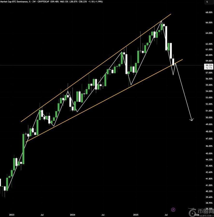 加密货币分析师 Ash Crypto 表示,随着比特币的主导地位跌破多年上升趋势线,季节可能即将到来。