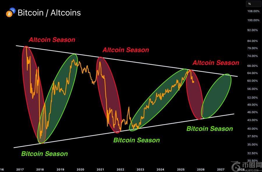 值得注意的是,加密货币分析师 Chiefy预测比特币的主导周期即将发生转变,当前的比特币季节预计将于 2025 年 8 月结束。历史市场模式显示出一种反复出现的趋势:比特币的主导地位在 2017 年初达到 68% 以上的峰值。在随后的季节,比特币的主导地位有所下降,随着的反弹,比特币的主导地位从 2021 年初的 71% 左右再次下降,最近一次从 2025 年中期的 66% 回落。