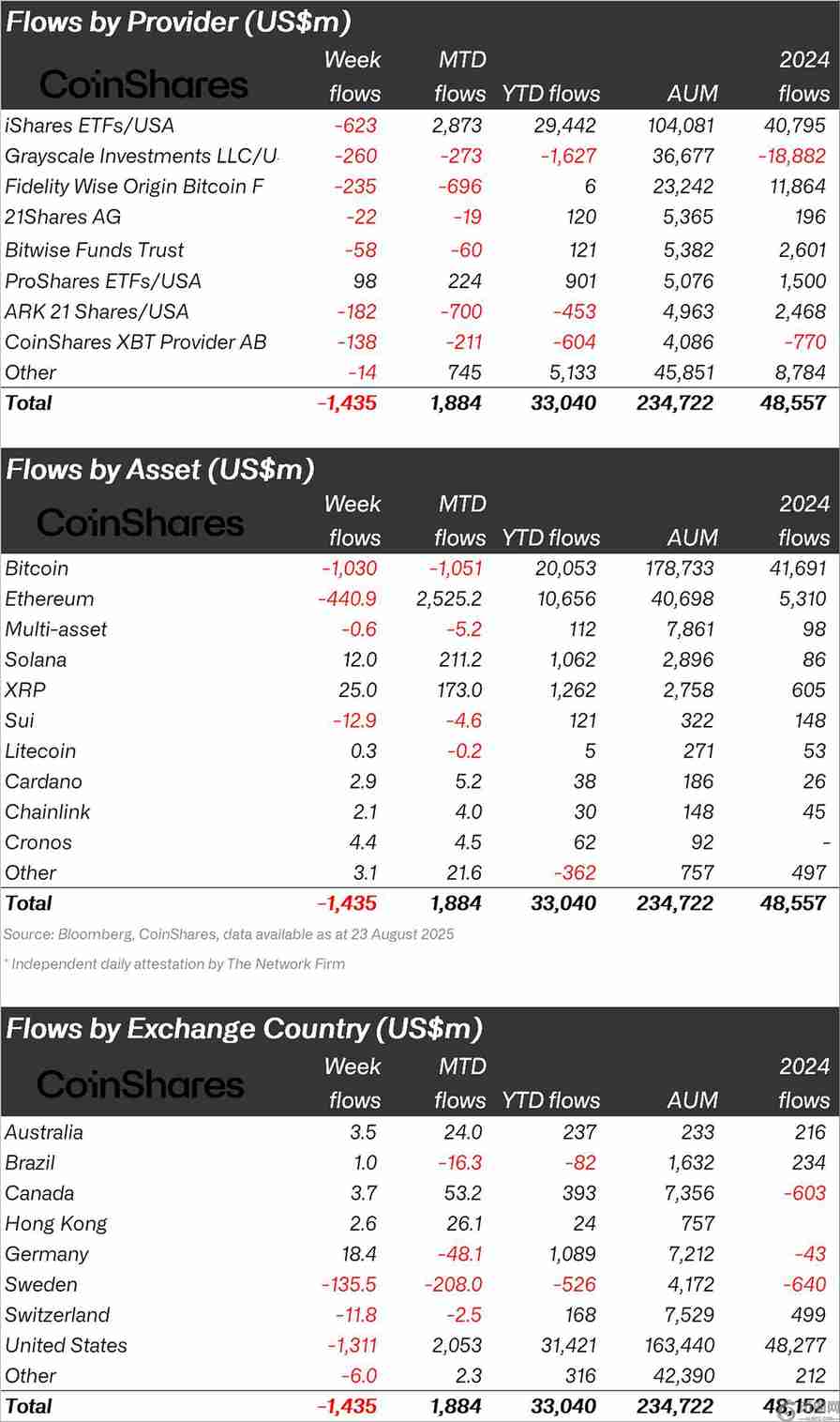 作为与以太坊、比特币挂钩的投资产品,XRP、Solana 和 Cardano 逆势而上,每周流出资金达 14.4 亿美元。
