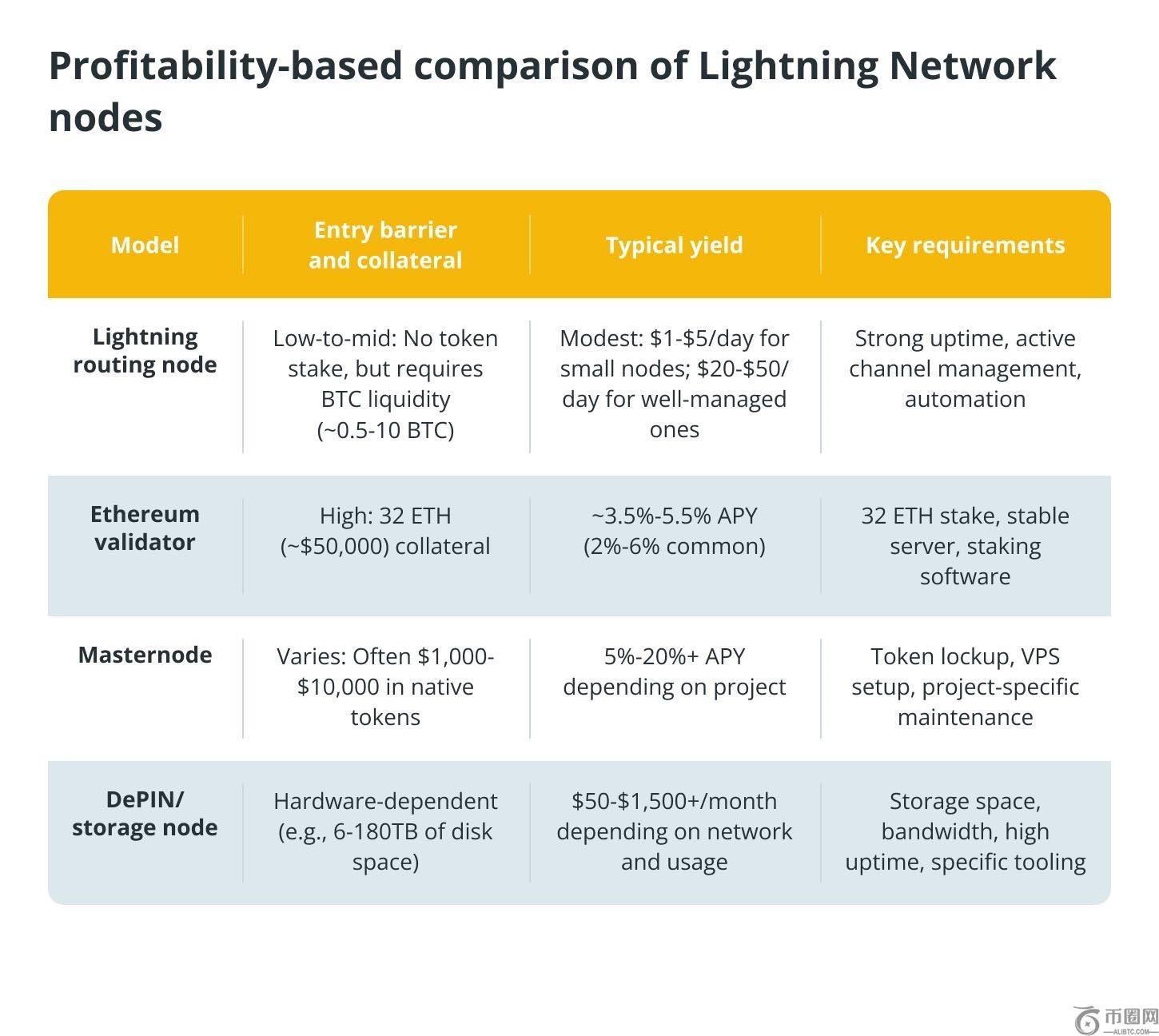 以下是 2025 年运行闪电节点与其他流行的加密被动收入方法的比较结果: