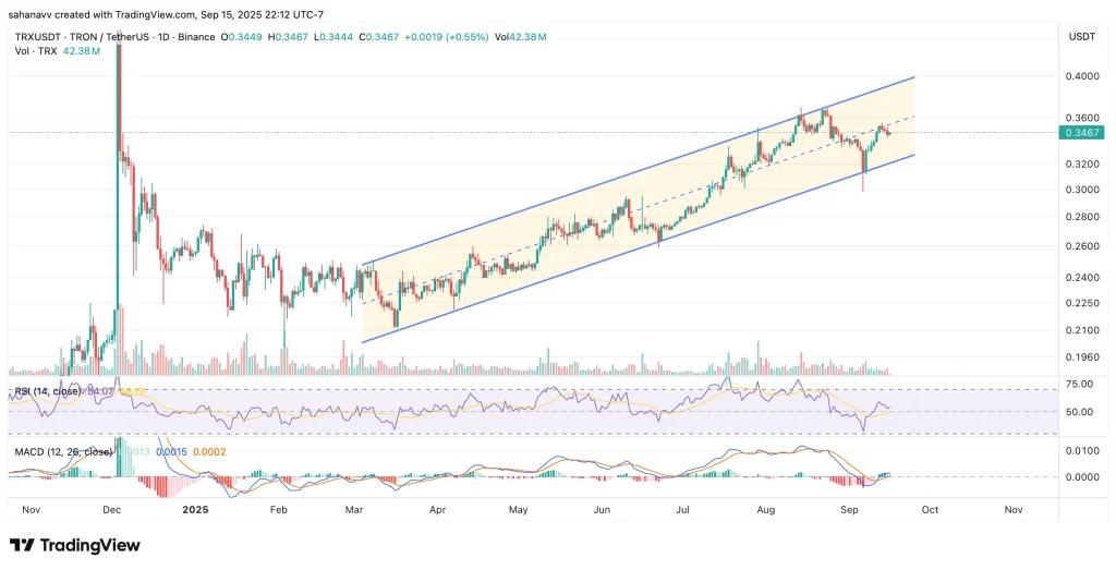 TRX 价格目前处于下行平行通道内,但从更宏观的角度来看,该代币仍处于牛市旗形形态内。此外,涨势在一目均衡表云图内持续,且各水平正朝着看涨交叉的方向发展。由于 RSI 指标下降,回调可能持续,随后出现反转并突破至年度新高。