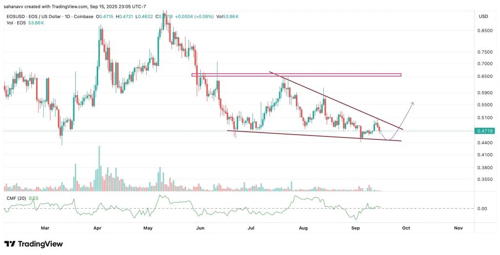 价格目前处于下降楔形内交易,突破阻力位后,可能回落至支撑位。然而,CMF 已升至 0 上方并试图守住,表明流动性已足够。因此,预计 EOS 价格将跌破 0.45 美元并压制抛售压力,随后反弹并突破楔形,达到 0.55 美元。
