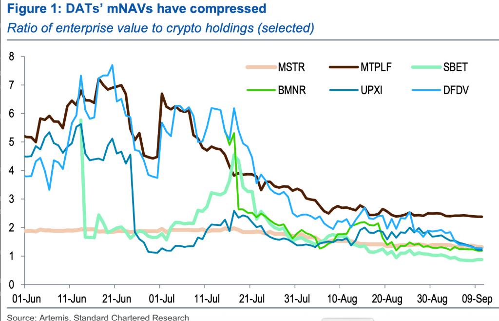 该银行在周一的一份报告中强调,投资者对 DAT 压缩的担忧是正确的。库存价格和资产净值 (mNAV) 会影响公司筹集现金以扩大加密货币持有量的商业模式。市值与资产净值之比 (简称 mNAV) 是指公司市值与其资产价值的比率。mNAV 大于 1 表示公司交易价格高于其净资产,这意味着市场信心。