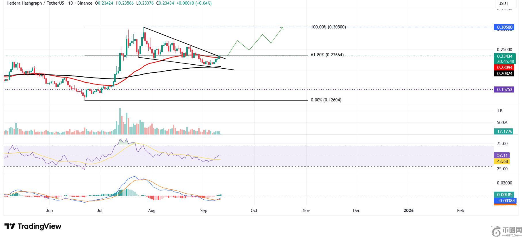 常春藤价格突破下跌楔形形态,预示未来将出现看涨走势。 受英国监管的数字资产交易所 Archax 宣布在 Hedera 网络上推出其 Pool Token 功能。 技术前景表明将出现反弹,多头目标为 0.305 美元。