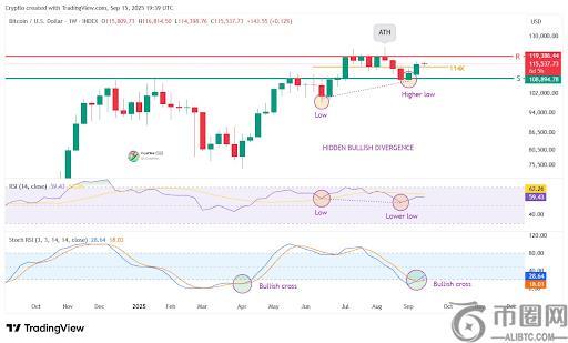 CrypFlow 分享的周线 K 线图显示,比特币守住了 114,000 美元左右的重要支撑位,目前已形成两个看涨的周线 K 线图。分析师表示,如果这种背离如预期得到证实,则可能为比特币再次创下新高奠定基础。截至本文撰写时,比特币交易价格较其当前的历史高点 124,128 美元下跌 5.7%。