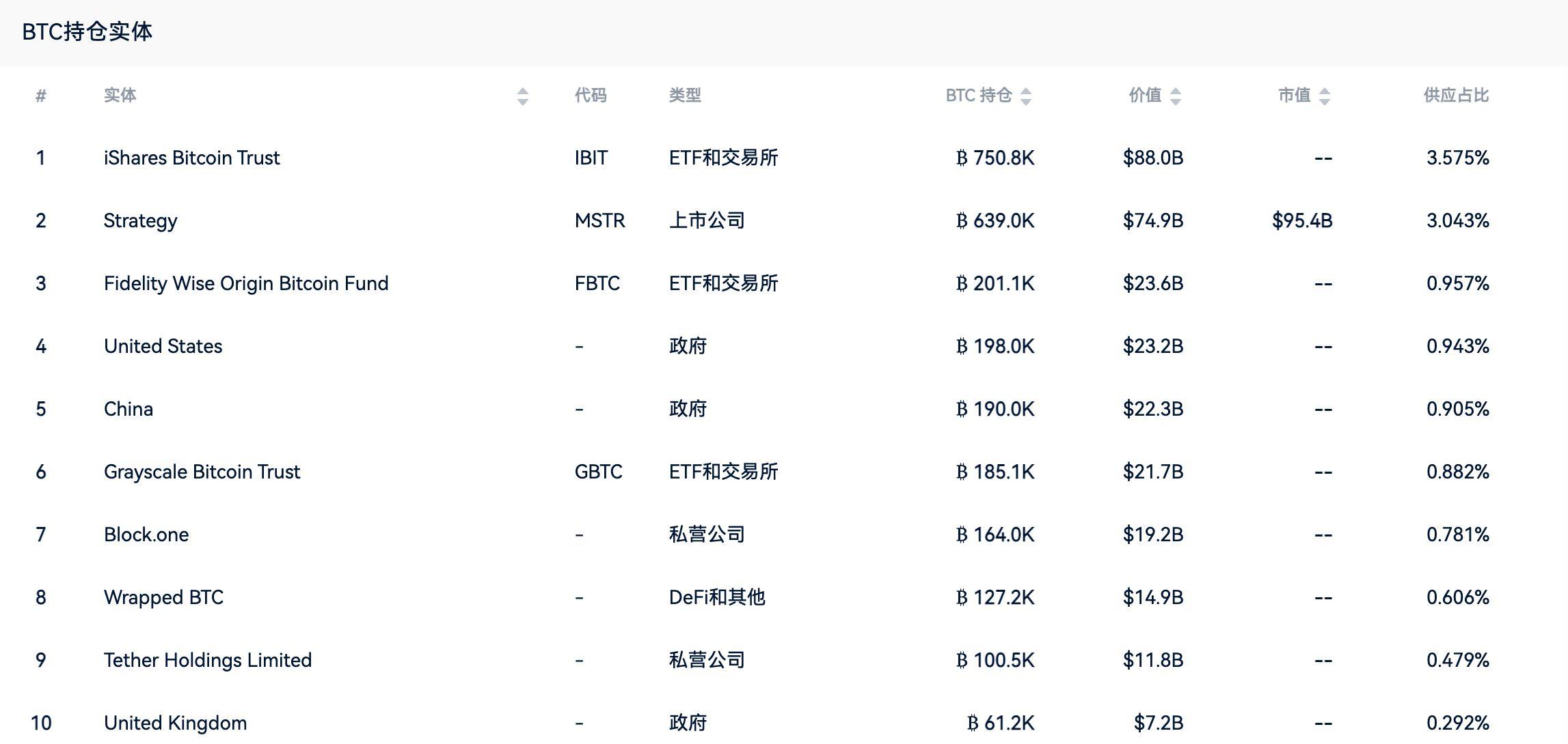 截至发文,BTC 持仓实体前10数据一览 (2025-9-18数据:AiCoin