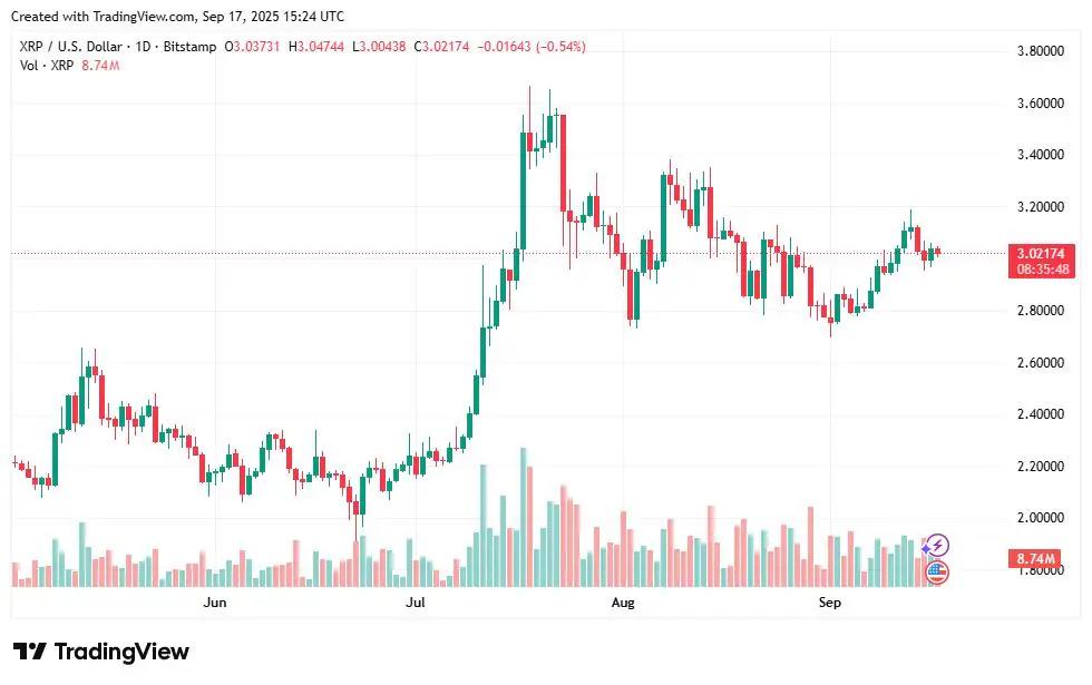 XRP 交易价略高于 3.00 美元,交易员们在美联储预期降息前积极布局。市场几乎确信美联储将降息 25 个基点。一些人甚至预计降息幅度将更大,达到 50 个基点。这表明市场在降息确认前仍抱有乐观情绪。
