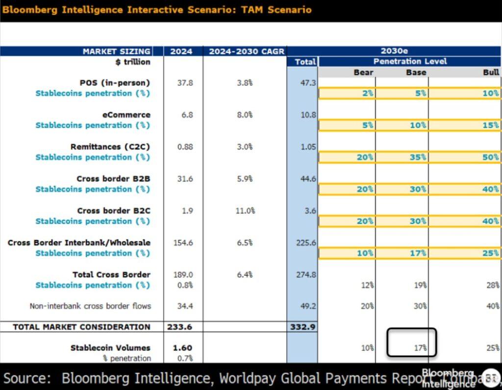 • 彭博社预测,到 2030 年,17% 的支付将通过稳定币进行。