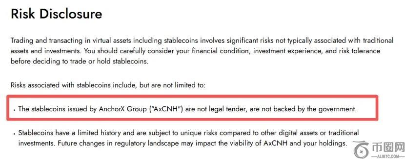 此外,根据飒姐团队的调查,AxCNH币发行方在公开风险披露文件中确认了该稳定币无政府背书、非法定货币、不具备法偿性等特征。