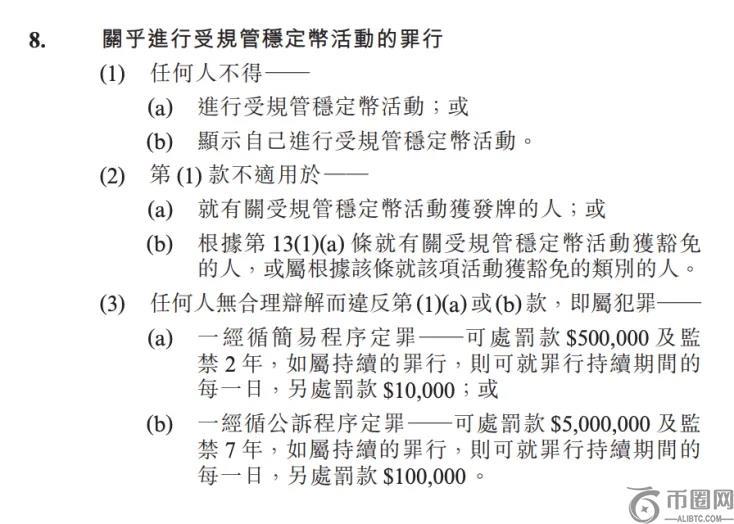 根据相关法规,任何未经授权进行受规管稳定币活动的行为均属犯罪。一经简易程序定罪,可处最高50万港元罚款及监禁2年;若是持续的罪行,则每日另处罚款1万港元。若经公诉程序定罪,可处最高500万港元罚款及监禁7年,持续罪行每日另处罚款10万港元。