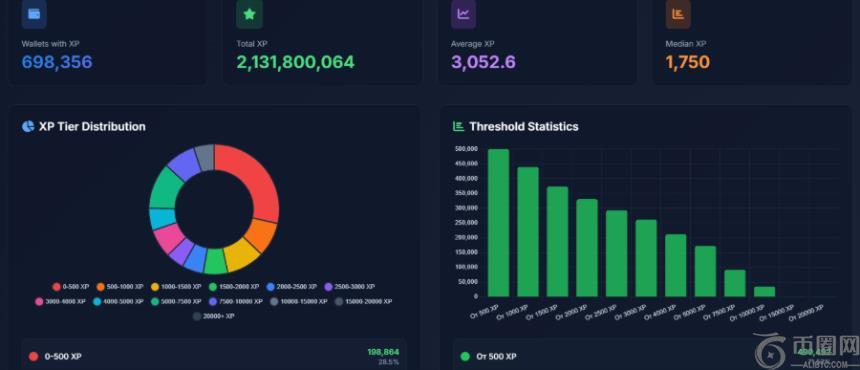 从XP数据分布可以更直观地观察到,目前已有累计约69.84万个钱包获得了XP,总积分超过21亿,单钱包平均约3,052 XP,中位数约1,750 XP。在分布结构上,积分较低的用户占据绝对多数,其中28.5%的用户积分低于500 XP。这表明大部分用户仅进行基础任务或轻度交互,真正深度参与的群体相对有限。与Blur当年的空投不同,本次活动并未引发大规模的刷量潮,一方面源于OpenSea将奖励机制与长期忠诚度挂钩,抑制了短期套利行为;另一方面,NFT市场整体低迷,投机资金保持谨慎。