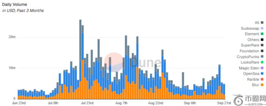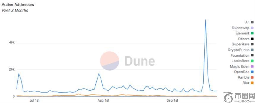 从日活跃地址数据来看,OpenSea在9月15日公布激励活动公告后,于9月16日迎来了近三个月的峰值,当日活跃地址数达到57,536,其中排名第二的Blur当天日活跃地址仅为730,差距极为悬殊。然而,这一高点并未延续,活动启动后的热度迅速回落,目前OpenSea的日活跃地址已降至约5,000左右。
