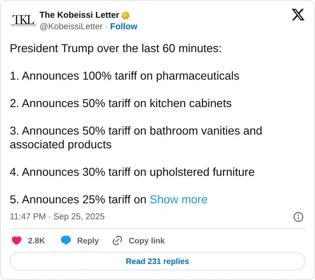 此外,美国总统唐纳德·特朗普将对药品、厨柜、重型卡车等产品征收关税,该政策将于10月1日生效,这增加了新的贸易中断风险。