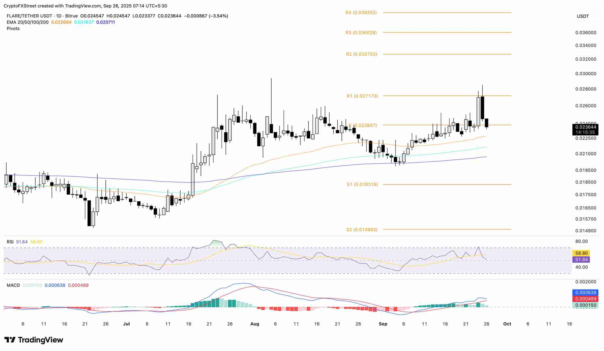 Flare 的直接支撑区域位于 50 天 EMA 的 0.22685 美元,其次是 100 天 EMA 的 0.021638 美元。
