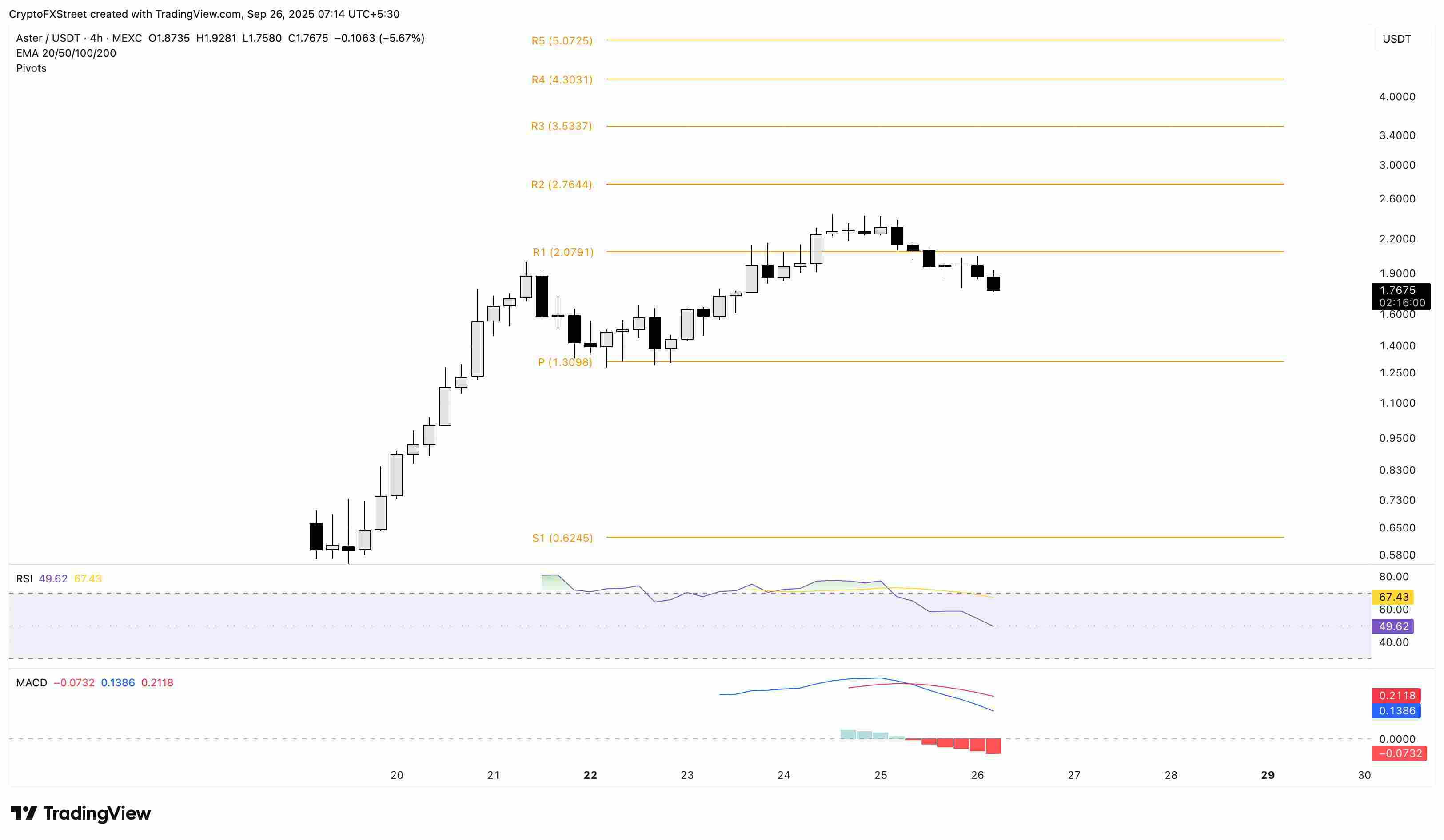 截至周五撰写本文时,Aster 股价已跌破 1.80 美元,延续了周四近 19% 的跌幅,当日跌幅超过 4%。突然跌破 2.00 美元的心理关口,增加了 ASTER 测试 4 小时图上 1.30 美元中心枢轴水平的风险。