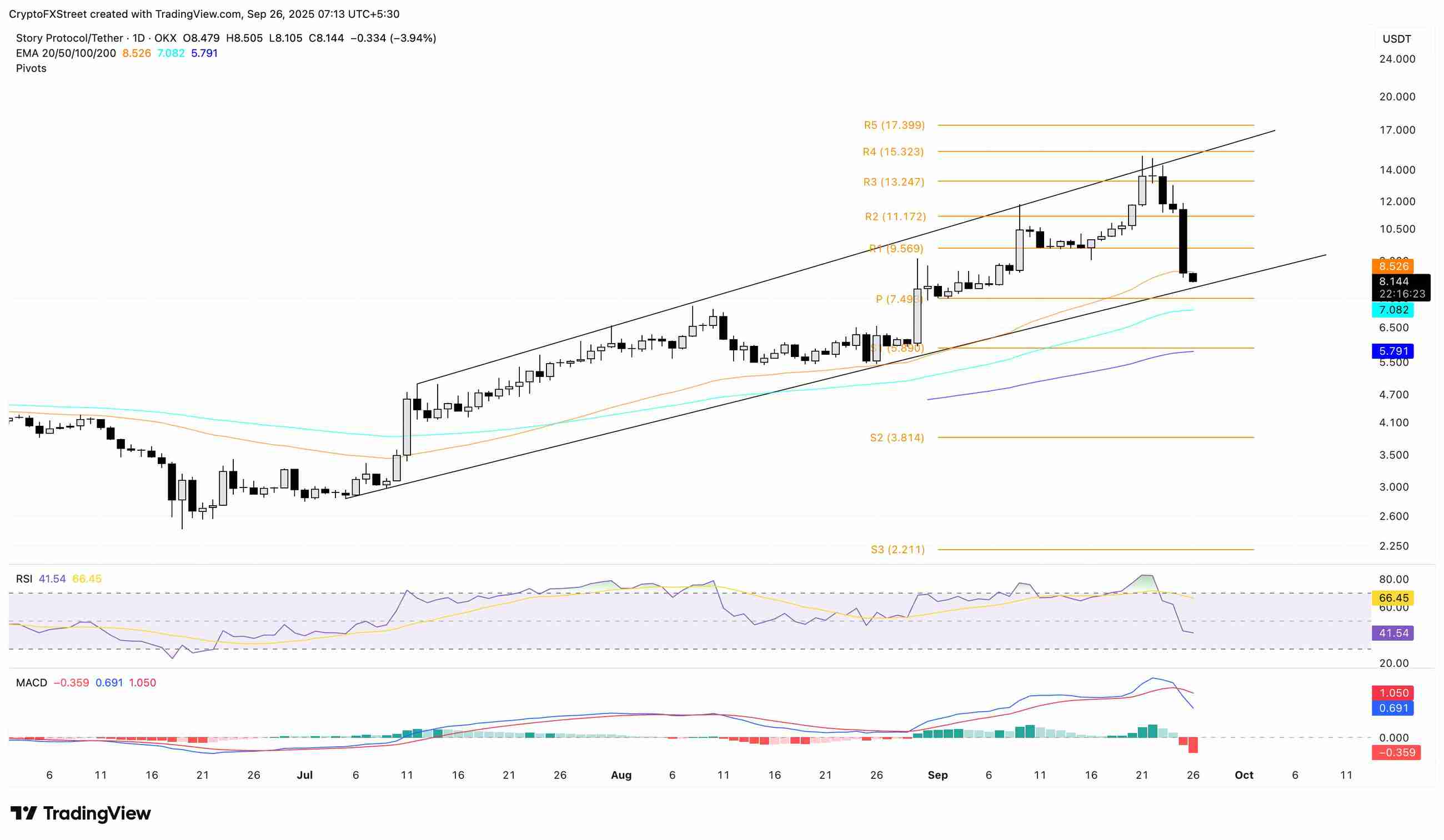 截至周五发稿时,Story 股价小幅下跌 4%,延续了前一天 26% 的跌幅。该股连续第四天下跌,并在日线图上测试上升通道形态的下边界。