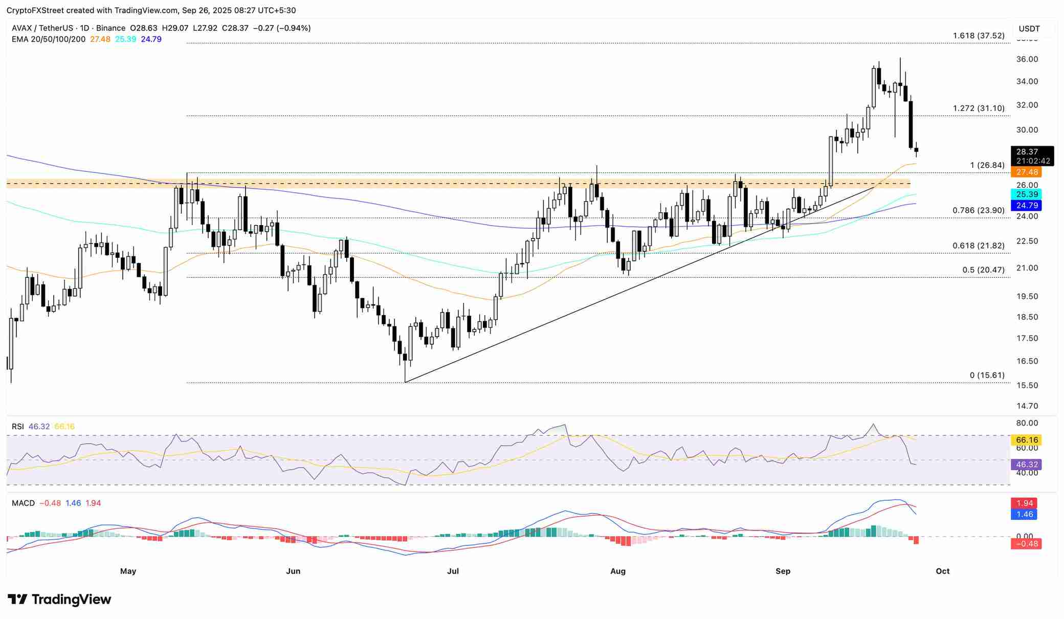 截至周五撰写本文时,Avalanche 的交易价格已跌破 30 美元,较前一天下跌 11%。AVAX 正接近其 50 日均线 27.48 美元,这可能成为其即时动态支撑位,并可能带来短期复苏。