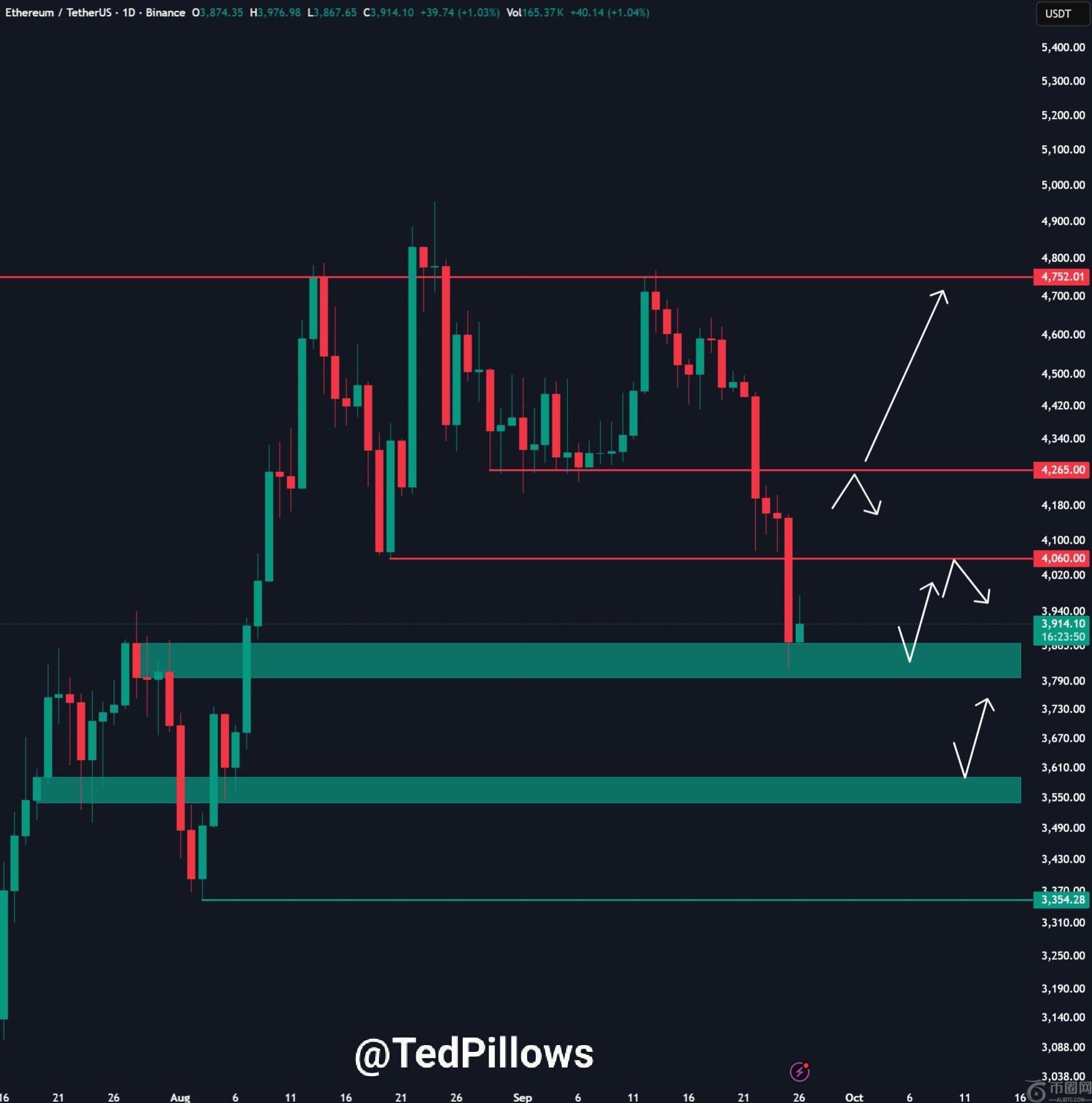 Ted Pillows 也确认的以太坊近期如预期般触及 3,800 美元的流动性区间。尽管以太坊已从该点位反弹,但仍低于 4,060 美元的支撑位。他认为,收复这一水平可能引发一轮反弹,但如果以太坊未能做到这一点,则可能进一步跌向 3,600 美元。