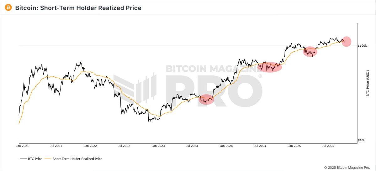 链上分析师 Burak Kesmeci 借助 X 平台分享更新比特币价格与短期持有者 (STH) 实际价格的关系。据加密货币专家称,BTC 价格今年已第四次跌破 STH 实际价格(约 111,500 美元)。