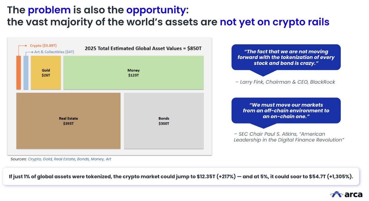 全球约 99% 的资产(股票、债券和房地产)尚未通过区块链进行转移。但这些资产很可能在不久的将来被代币化,并通过区块链进行转移,从而取代如今存在的大量毫无意义的加密资产。