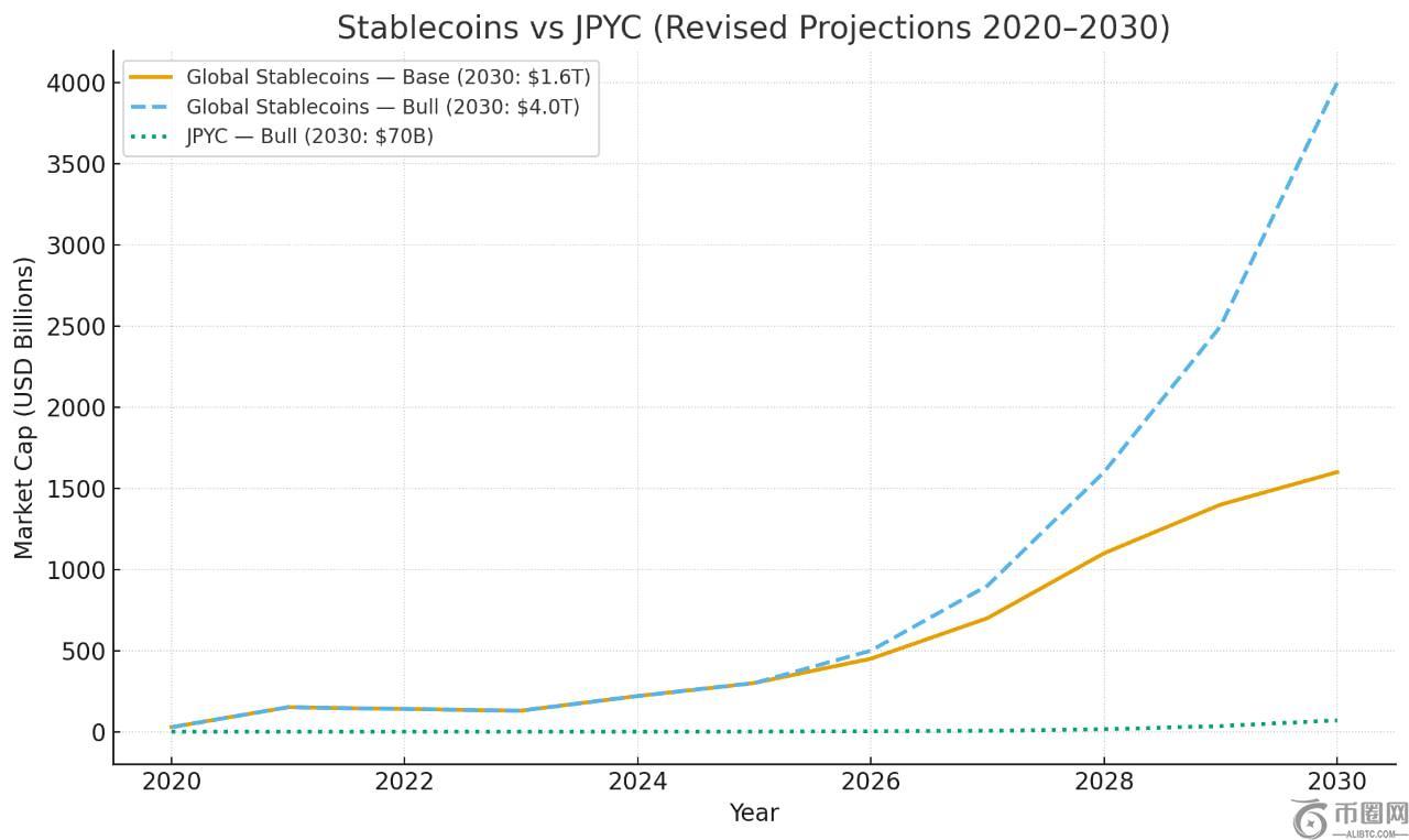 据 CryptoQuant 称,稳定币的总市值现已超过 1500 亿美元,成为加密货币市场、DeFi 协议和全球支付流动性的支柱。花旗和彭博的分析师预测,到 2030 年,这一数字可能会扩大到 1.6 万亿至 4 万亿美元。在如此快速的增长中生长预计 JPYC 将占据约 2% 的市场份额,估值达到约 700 亿美元。