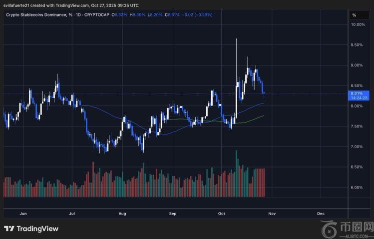 图表显示,稳定币的市场主导地位目前约为 8.31%,此前 10 月初该比例曾大幅上升至 9% 以上。这一水平通常预示着对流动性和安全性的需求增强,因为在市场不确定的情况下,交易员会将资金转移到稳定资产中。