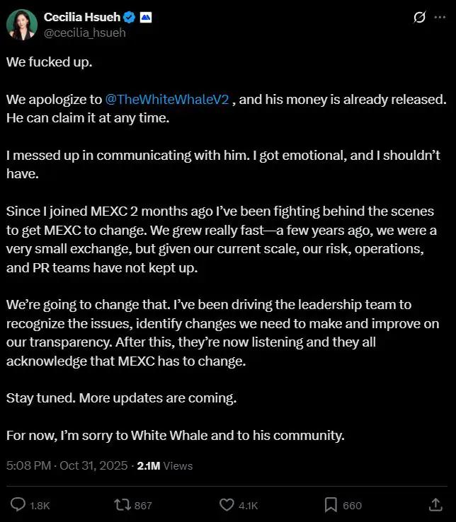 10 月 31 日,MEXC CSO Cecilia Hsueh,公开道歉因在 7 月份冻结了一位被称为“白鲸”的用户的 300 万美元资金。