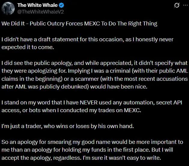 据薛先生称,由于风险控制规则导致资产被冻结,交易所处理此事的方式欠妥。MEXC已解冻资金,并邀请White Whale随时认领。