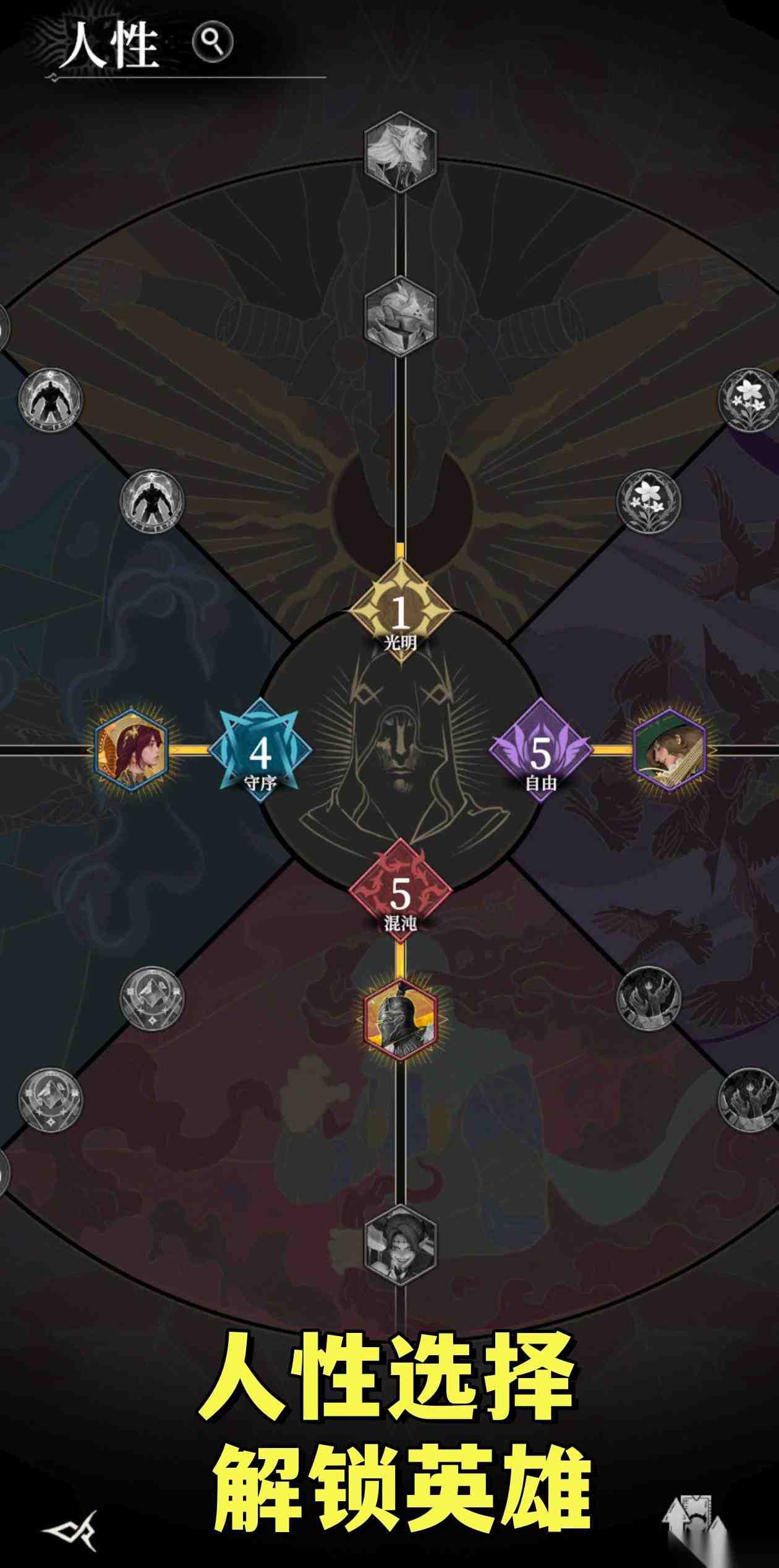 二、英雄的解锁除了主线任务的正常推进,还有关于“人性”的选择,一般选混沌跟自由的多一些!