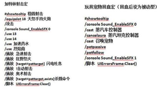 最后再发几个经过优化的自动射击宏,可以根据自己的需求来替换武器,加入了奥射没加多重,让你的队友感受一下魔兽怀旧服兽王加特林的威力吧。配合之前那个蒸汽坦克玩具给宝宝回血的宏,现在的猎人真就TBC唯一指定DPS,除了费钱基本没有缺点了。