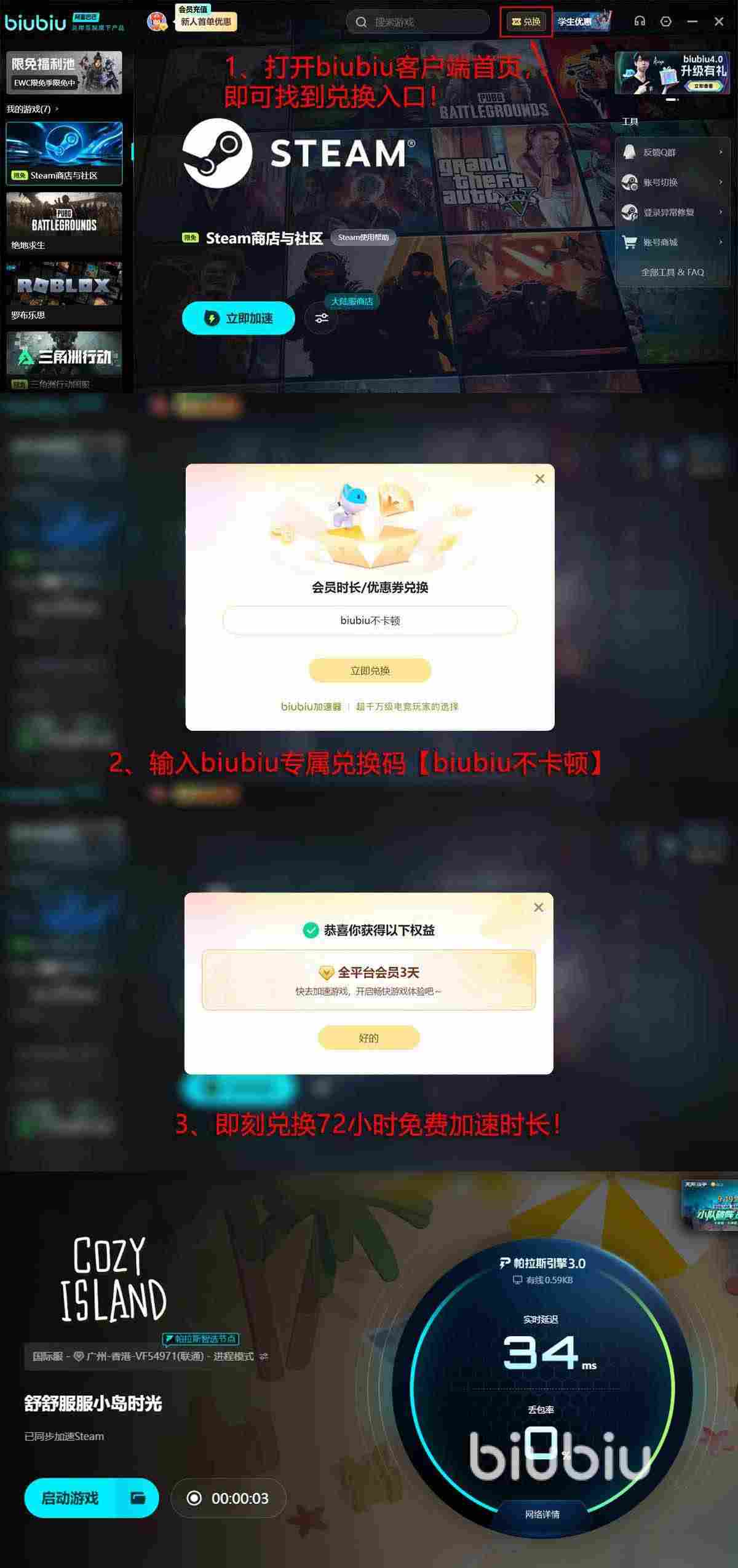 那么,想必有玩家想知道使用biubiu能免费体验吗?答案是肯定,在和冠军选手Aixleft完成各功能优化之后,biubiu新版本和多个福利同步上线,其中新人能领二十四个小时福利,同时全员能输入【biubiu不卡顿】兑换到三天免费福利,这些福利对于新人来说可同步领取,且福利时间能直接累积96小时。