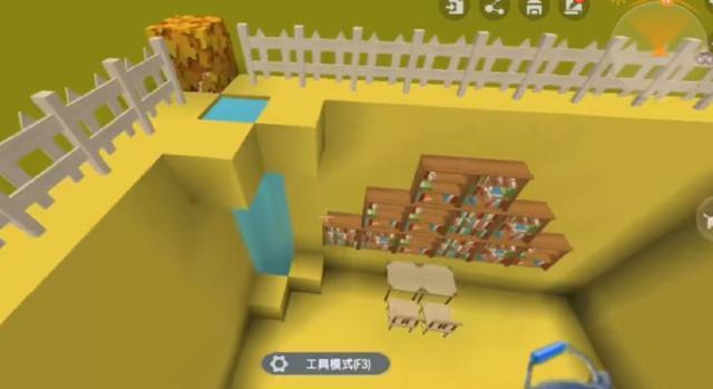 迷你世界隐藏书屋制作方法是首先,空地挖出长和宽11,高为7,彩弹枪整个坑喷成黄色。整个坑与地面相平的位置,用围栏围城一个圈。四个角位置换上树叶。白色硬沙块搭出一条向下的楼梯,闪金矿石在楼梯最外侧搭出一条边。