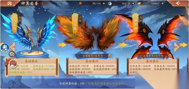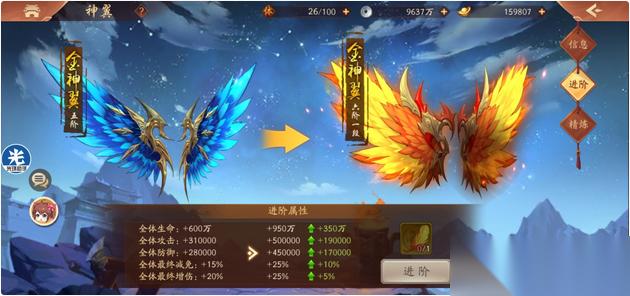 幽蝶羽毛是武将觉醒的核心材料,觉醒后武将的生命、攻击和防御属性会得到全面强化。翅膀系统同样依赖羽毛激活,不同阶段的翅膀提供不同幅度的全体属性增益,例如一阶翅膀增加全体生命和攻击,三阶翅膀还会附加最终增伤效果。羽毛的积累需要长期投入,但带来的战力提升非常可观,尤其在PVP和高端副本中表现突出。