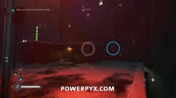 在冰川酒店西南方向街对面的小巷里,涂鸦位于南侧屋顶的东面墙壁上。