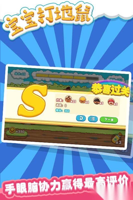 《宝宝打地鼠》的游戏玩法也很简单,在地鼠出了洞口露出脑袋的时候,要准确的去瞄准直接敲下去,这样就会获得更多的分数,当然当中的竞争也是相当的不错,可以尽快的去闯关,感受一下新鲜的乐趣。很多宝宝在玩这款游戏的时候都真的是很开心。想要在游戏当中寻找快乐,那简直是太简单的事情了。