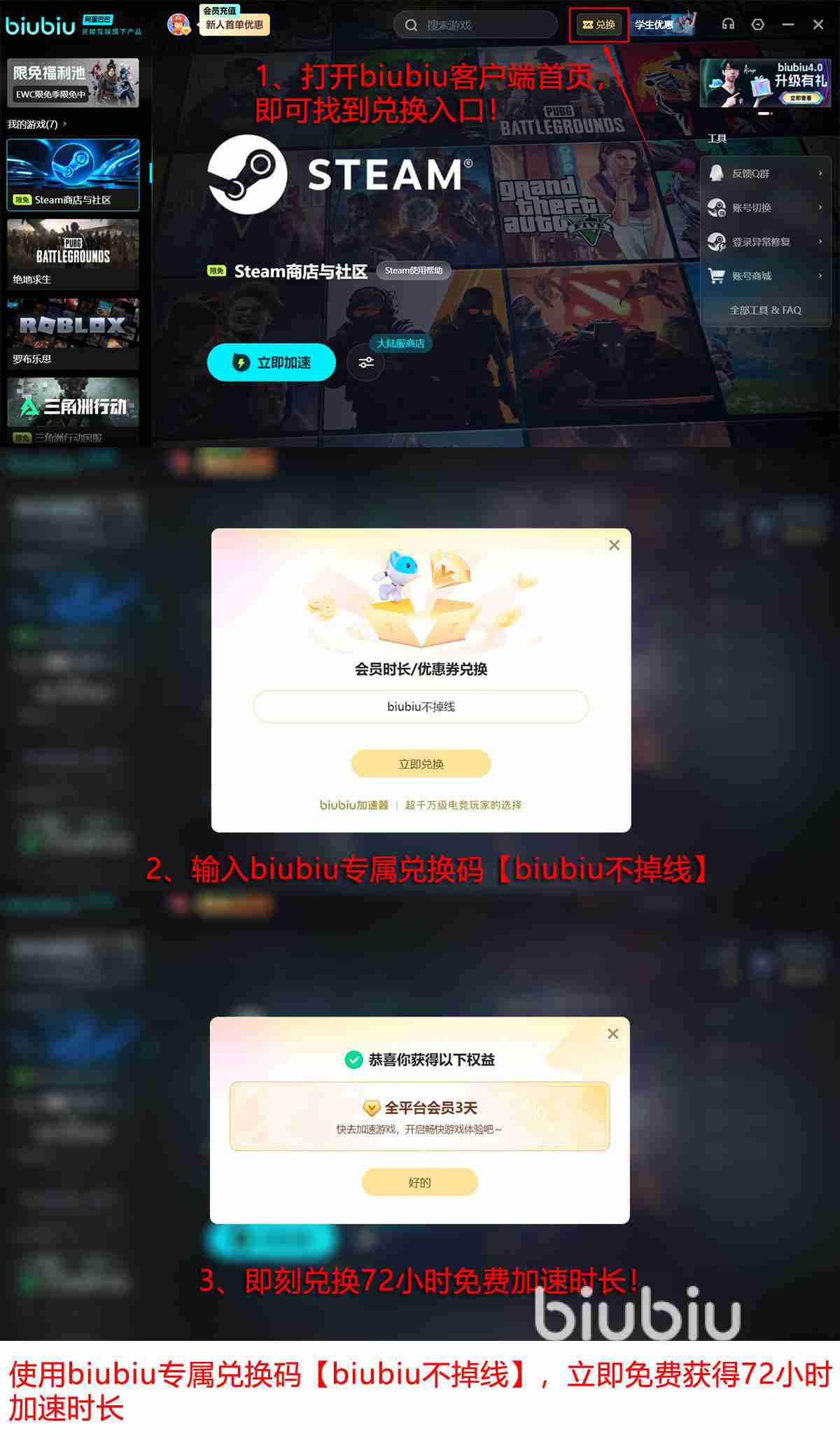 更令人惊喜的是,biubiu加速器为新玩家准备了零负担的畅玩福利,新用户注册成功时,平台将自动赠送24小时全功能加速权益,此外输入【biubiu不掉线】稳定流畅继续72小时,两大福利叠加总计高达96小时免费加速体验。
